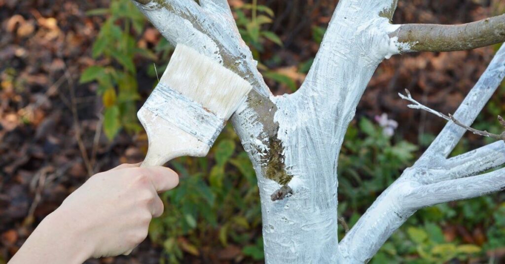 Лучший состав: 2 кг извести, 1 кг глины, 300 г медного купороса и 10 л воды. Молодые деревья можно покрывать акриловой садовой краской — она дольше держится и не повреждает кору.